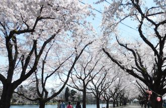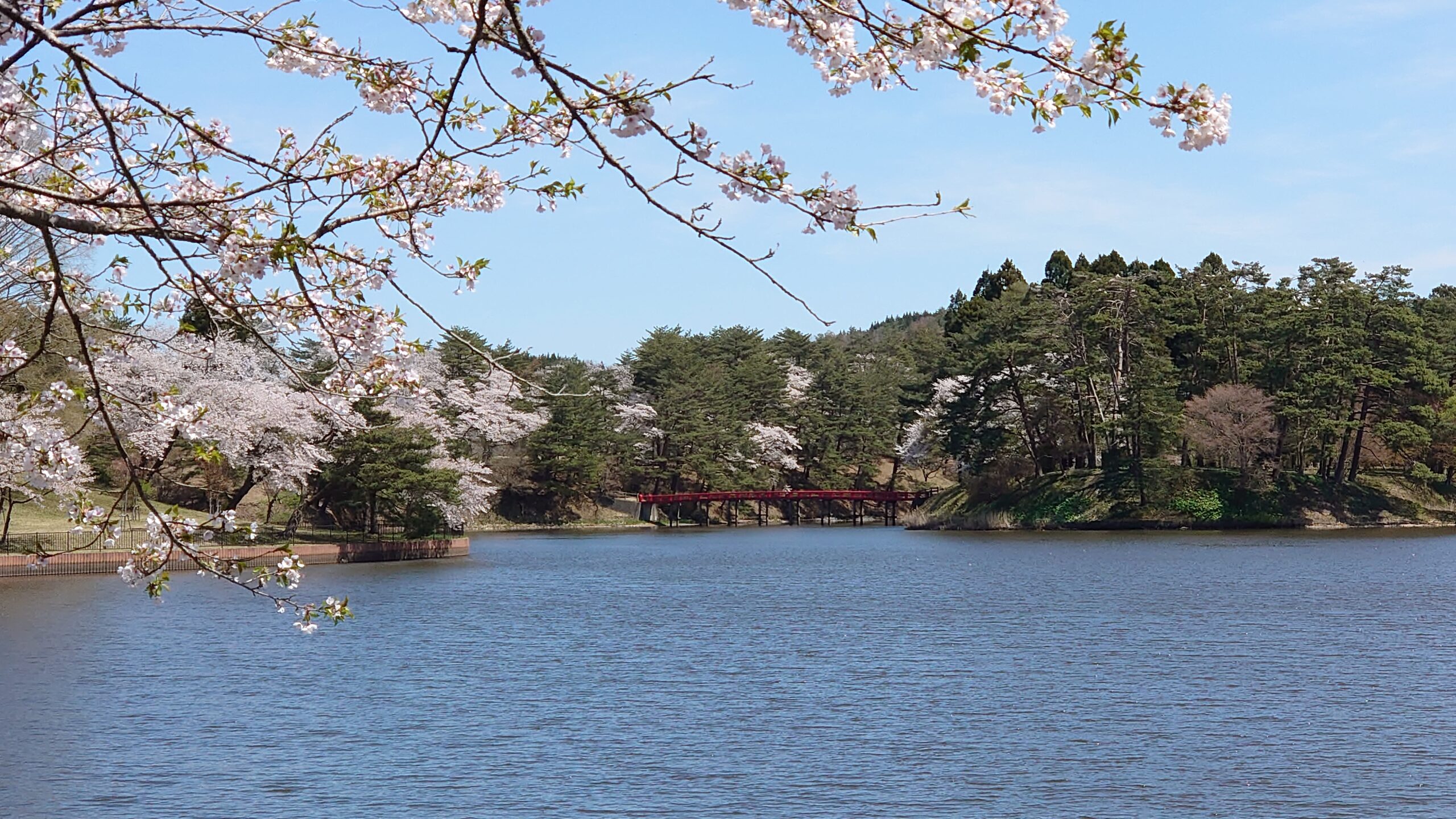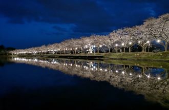 鷹巣中央公園は秋田三十景にも選ばれた景勝地。約800本の桜が咲き誇り、湖面に映る桜や夜のライトアップも絶景です。