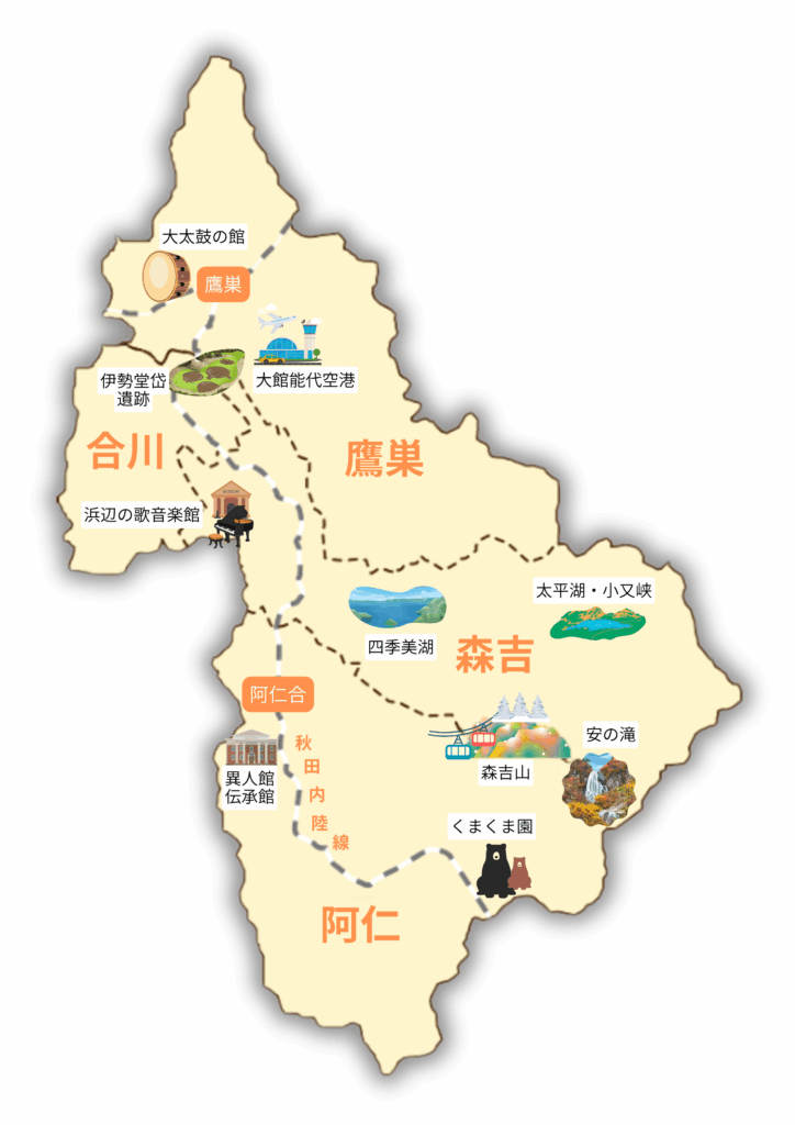 2005年(平成17年)3月22日に、北秋田郡の鷹巣町、合川町、森吉町、阿仁町の4つの町が新設合併し「北秋田市」が誕生しました。森林面積においては、秋田県一という、自然豊かな市です。