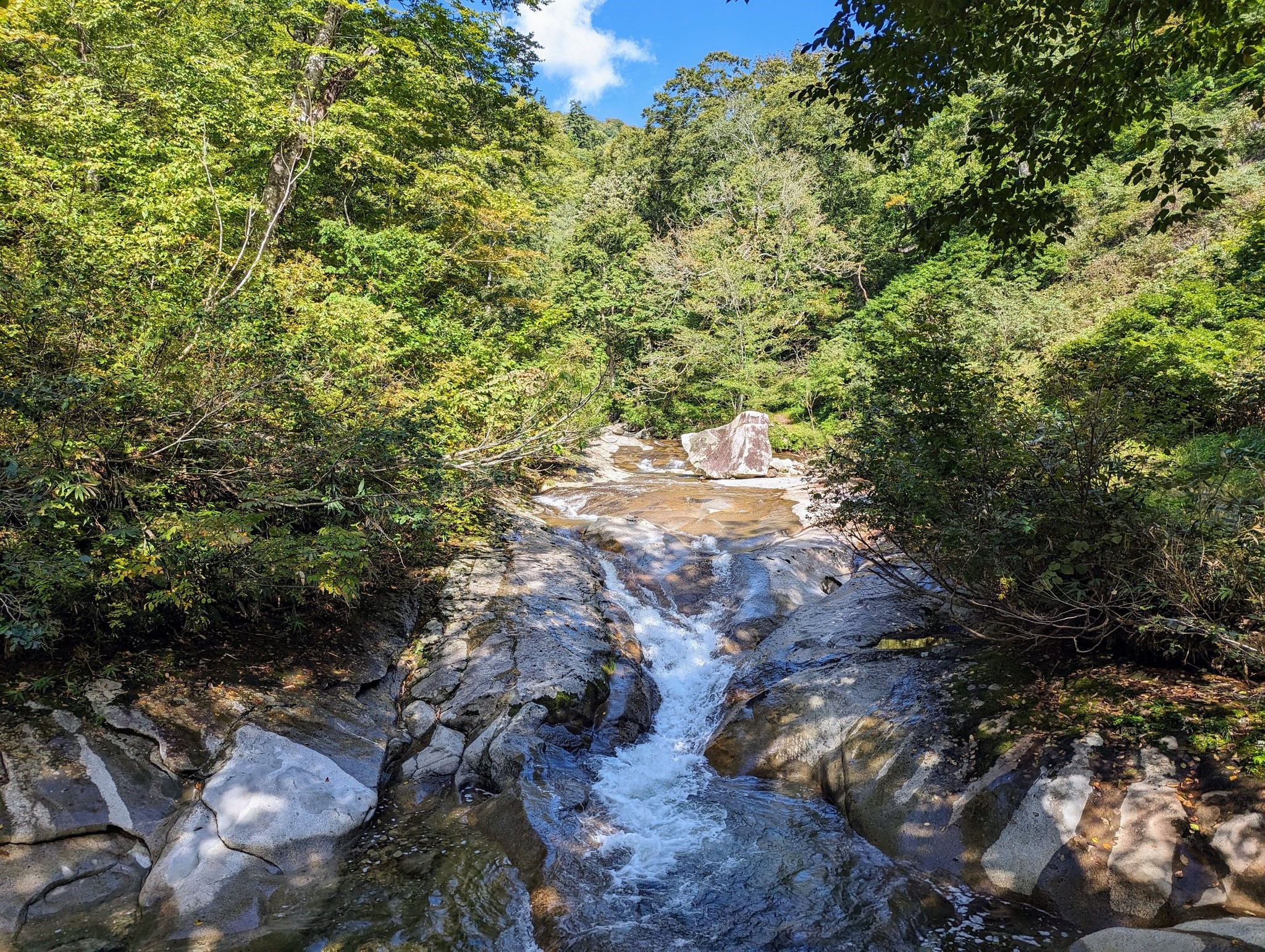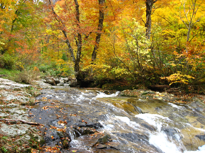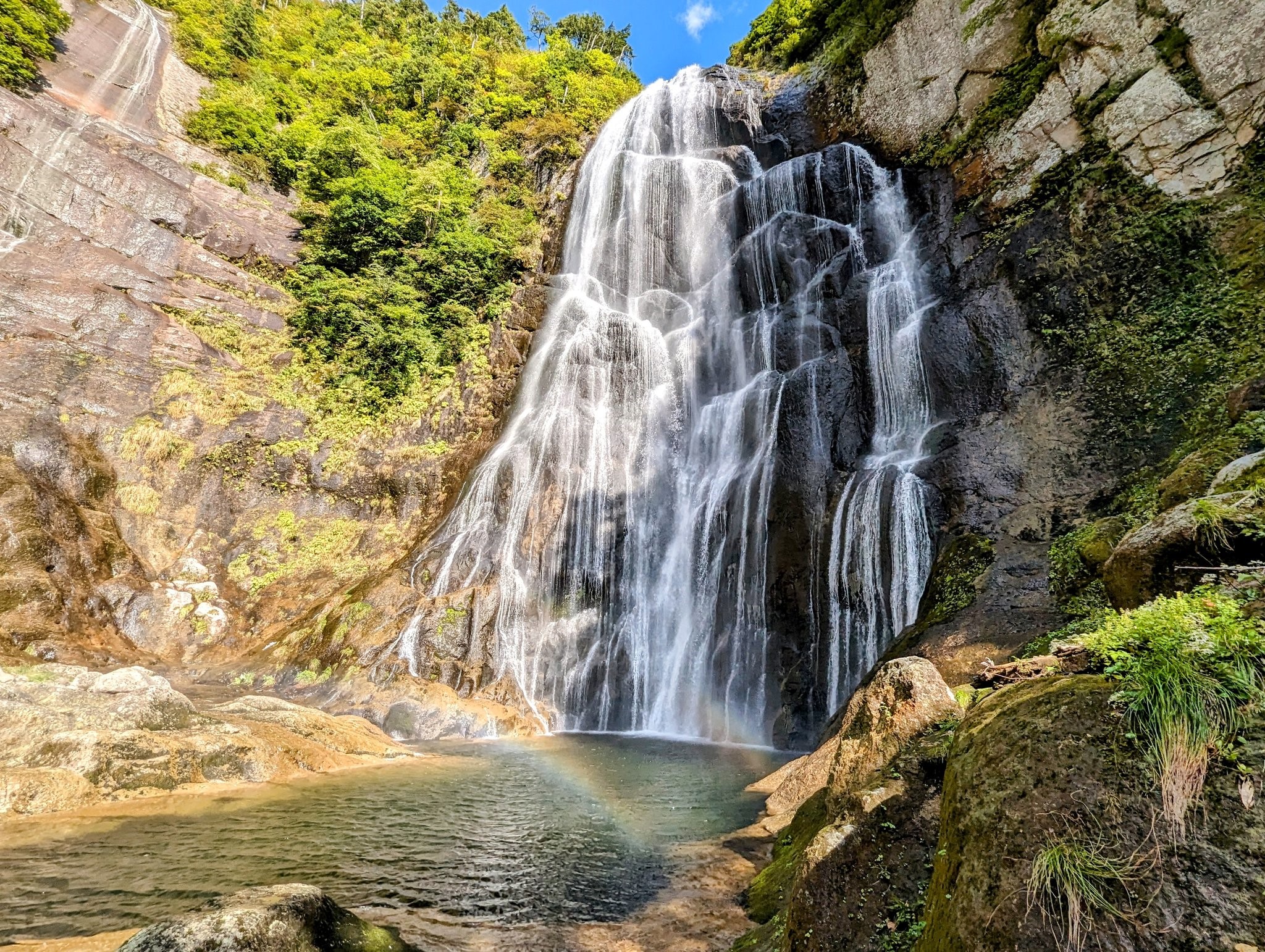 「日本の滝百選」に選ばれる安の滝は、森吉山北西に位置する二段の美しい滝(高さ60mと15m)です。新緑から紅葉の時期まで、豊かな自然の中を流れ落ちる姿は圧巻です。滝壺までは遊歩道が整備されており、駐車場から片道約1時間のハイキングで到着します。